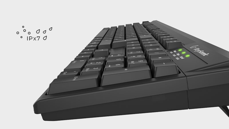 Stellen Sie sich einen Arbeitsbereich vor, in dem Verschüttungen nur ein Teil der Geschichte sind, nicht das Ende. Mit der KSK-8008U-IP Tastatur keine Angst vor Flüssigkeiten. Mit der Bewertung IPX7 kann sie bis zu 1 Meter tiefes Wasser für 30 Minuten überstehen und bietet Schutz gegen das Unerwartete, sei es in belebten Cafés oder Ihrem ruhigen Homeoffice.